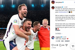 体育资讯3月11日讯 在沃克退出英格兰队后,他的国家队队友凯恩更新社交媒体送上祝福。