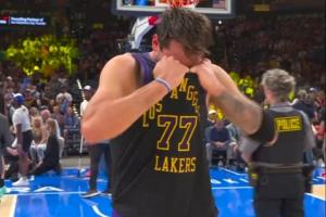 比赛第三节,东契奇在一次突破中受伤倒地,随后双手掩面非常痛苦。