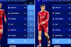 德转数据统计显示,本赛季代表利物浦出战身价最高的6个对手(曼城、皇马、巴黎、阿森纳、曼联、切尔西),维尔茨(共计659分钟)和埃基蒂克(共计494分钟)仅收获0球0助攻: